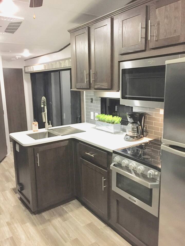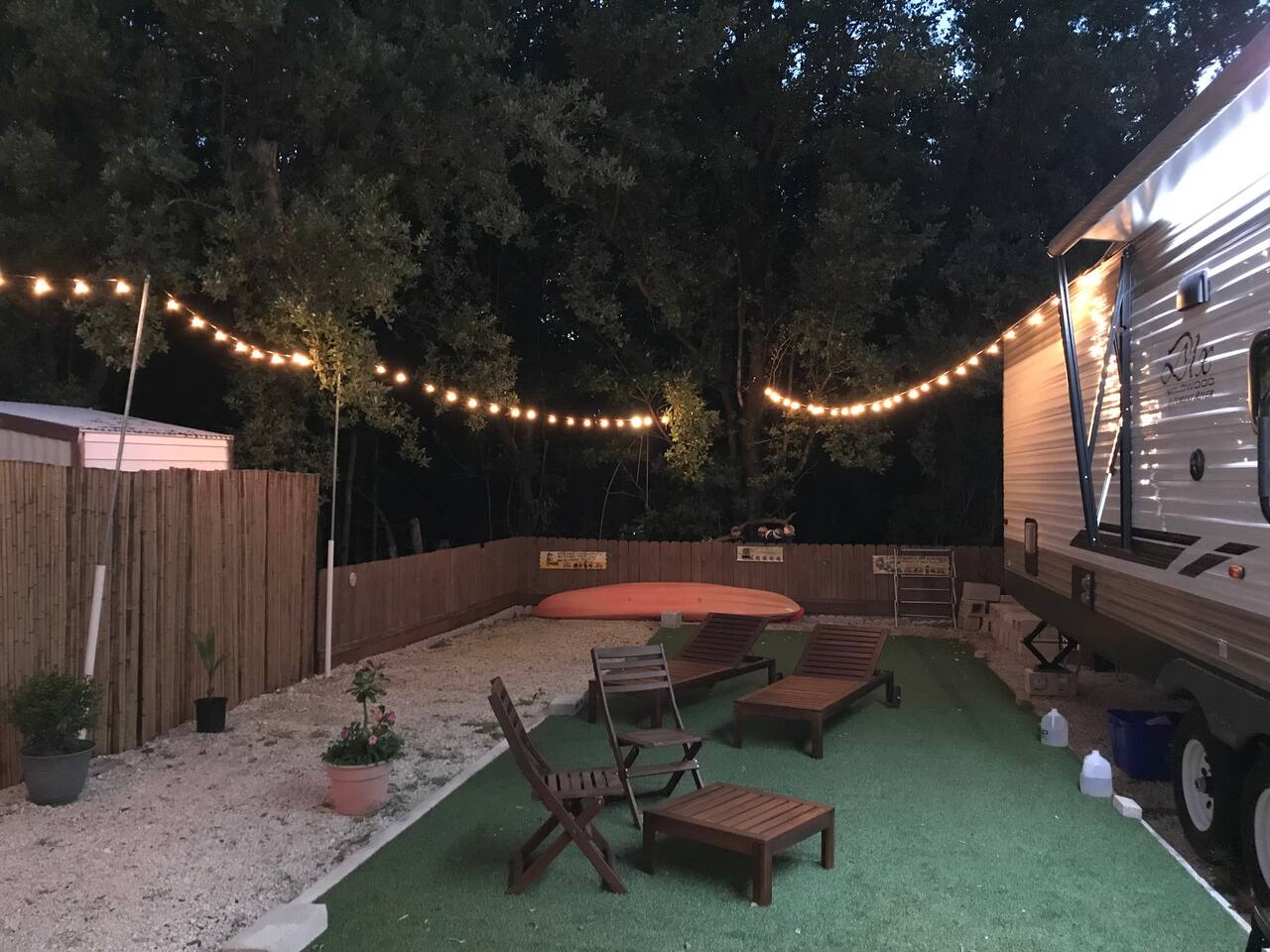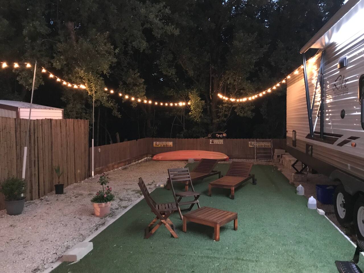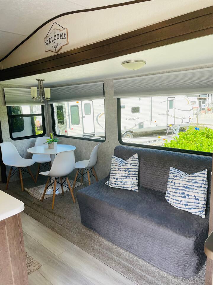 Welcome to our 2019 42' travel trailer, offering all the comforts and amenities of a house. Each of the 2 bedrooms features a queen-sized bed, complemented by 2 full bathrooms for added convenience. The sofa converts into a small futon bed, perfect for a child. Step into the full-sized kitchen, equipped with a 3-burner cooktop, oven, full-sized refrigerator, microwave, and all the essentials for meal preparation, including plates, glasses, pots, pans, utensils, and flatware. Outside, you'll find a cozy patio surrounded by string lights, a tiki hut with a dining table for al fresco dining, a charcoal grill, and lounge chairs for relaxation. Towels and linens are provided, and entertainment options include a large smart TV with cable and a gas fireplace. Stay connected with free WiFi internet access. Laundry facilities are available on-site, and please note that only 2 vehicles are allowed to be parked at this property (boat trailers are considered vehicles). As for campground amenities, enjoy a 24-hour security gate, marina, new boat ramp, ice supply, playground, 2 beaches, heated swimming pool, kiddie pool, horseshoe court, shuffleboard court, volleyball court, bocce ball, basketball court, general store, and open-air lounge. Enjoy complimentary 2 kayaks and 2 paddleboards for aquatic adventures. Please be advised that guests bringing vessels must provide boat and trailer registration, as well as their insurance policy, within 24 hours of booking to avoid any delays or additional fees. We look forward to hosting you for a wonderful stay!