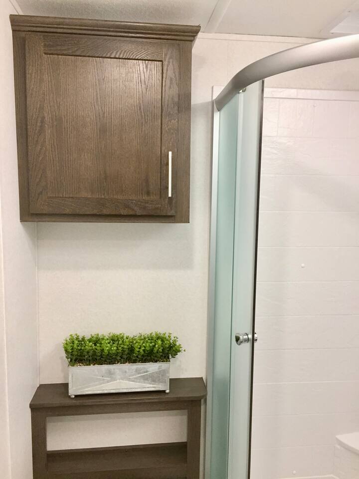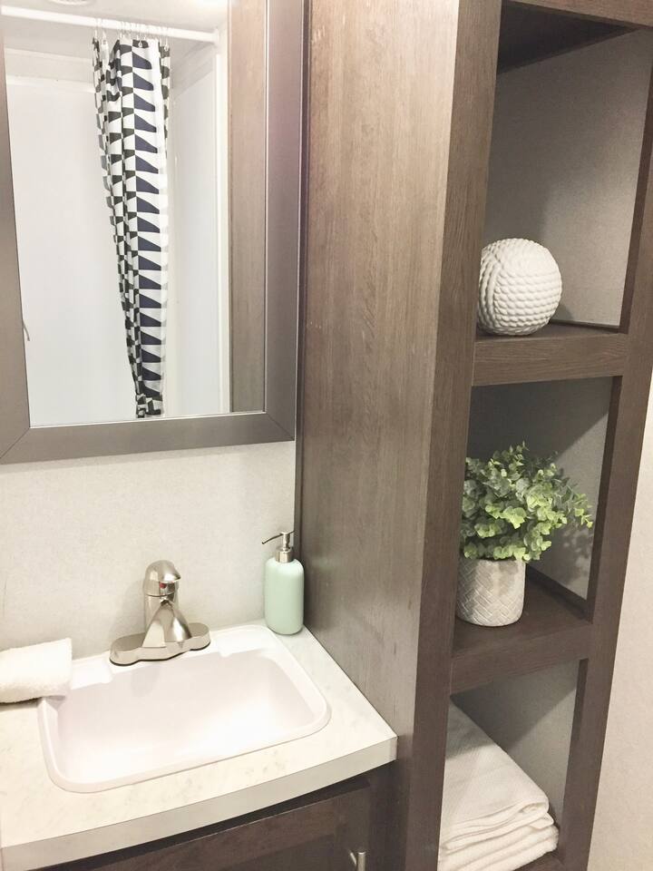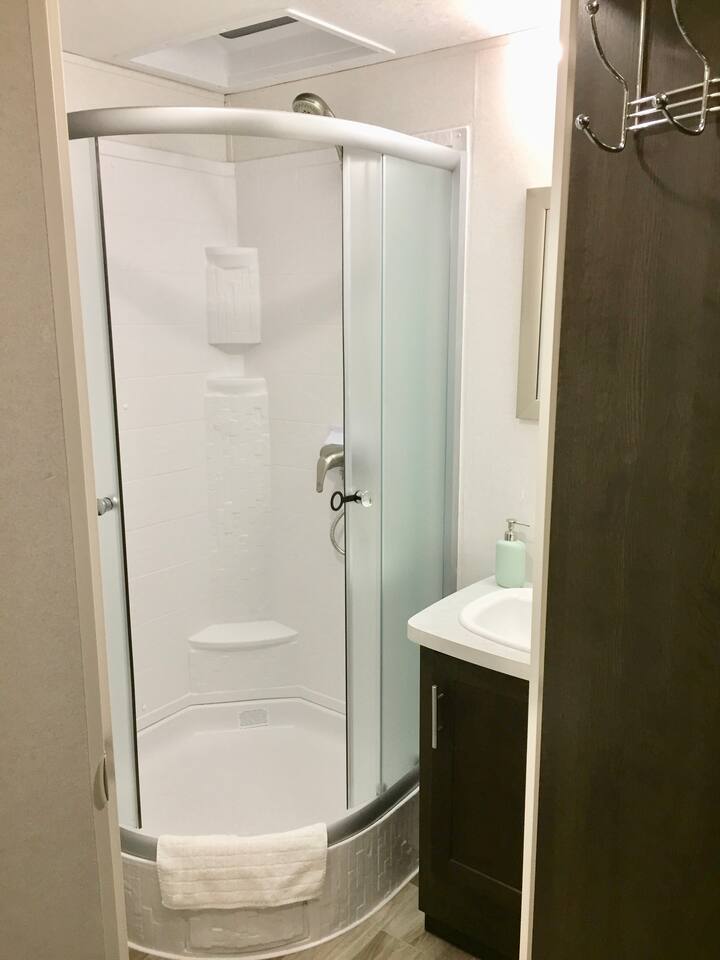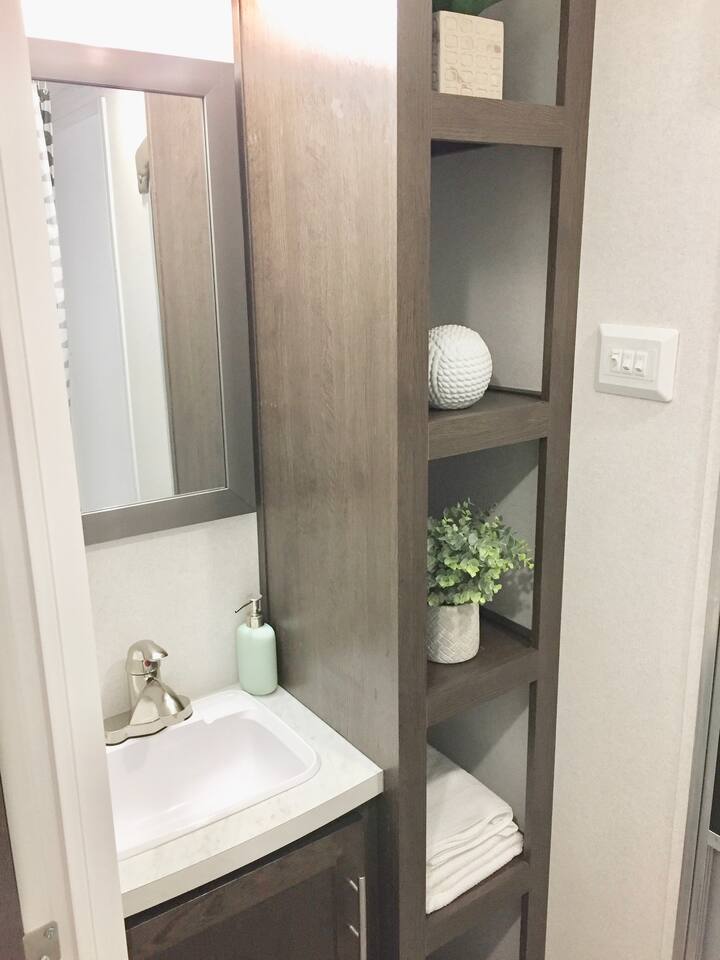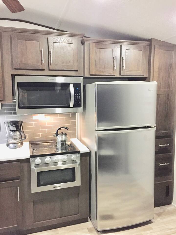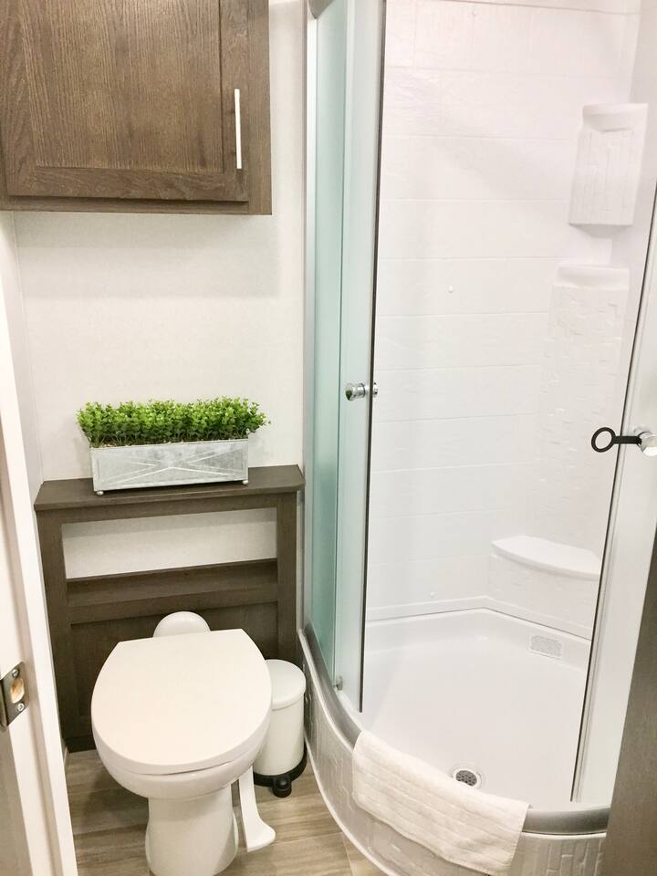Welcome to our 2019 42' travel trailer, offering all the comforts and amenities of a house. Each of the 2 bedrooms features a queen-sized bed, complemented by 2 full bathrooms for added convenience. The sofa converts into a small futon bed, perfect for a child. Step into the full-sized kitchen, equipped with a 3-burner cooktop, oven, full-sized refrigerator, microwave, and all the essentials for meal preparation, including plates, glasses, pots, pans, utensils, and flatware. Outside, you'll find a cozy patio surrounded by string lights, a tiki hut with a dining table for al fresco dining, a charcoal grill, and lounge chairs for relaxation. Towels and linens are provided, and entertainment options include a large smart TV with cable and a gas fireplace. Stay connected with free WiFi internet access. Laundry facilities are available on-site, and please note that only 2 vehicles are allowed to be parked at this property (boat trailers are considered vehicles). As for campground amenities, enjoy a 24-hour security gate, marina, new boat ramp, ice supply, playground, 2 beaches, heated swimming pool, kiddie pool, horseshoe court, shuffleboard court, volleyball court, bocce ball, basketball court, general store, and open-air lounge. Enjoy complimentary 2 kayaks and 2 paddleboards for aquatic adventures. Please be advised that guests bringing vessels must provide boat and trailer registration, as well as their insurance policy, within 24 hours of booking to avoid any delays or additional fees. We look forward to hosting you for a wonderful stay!