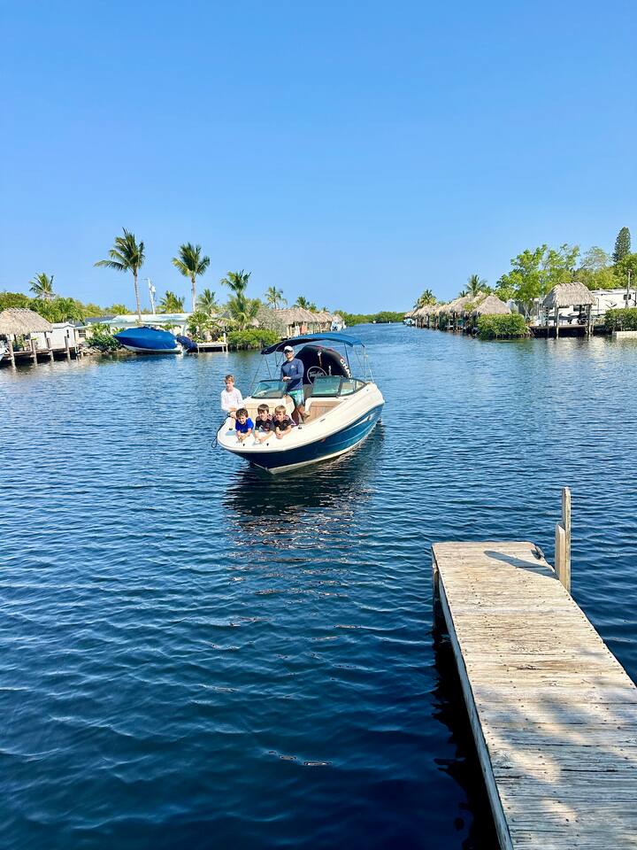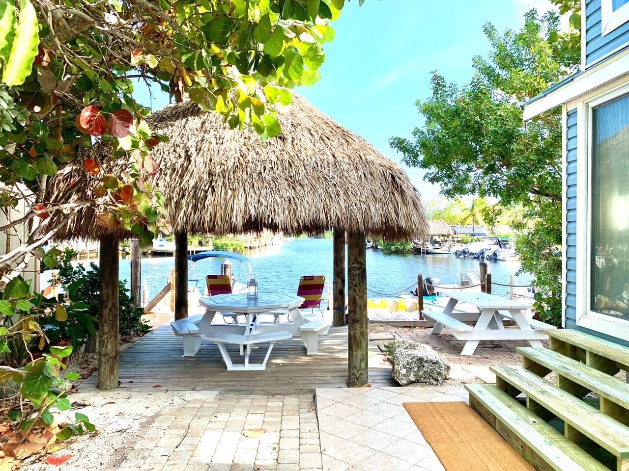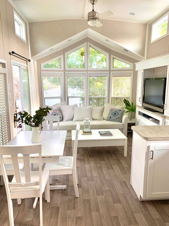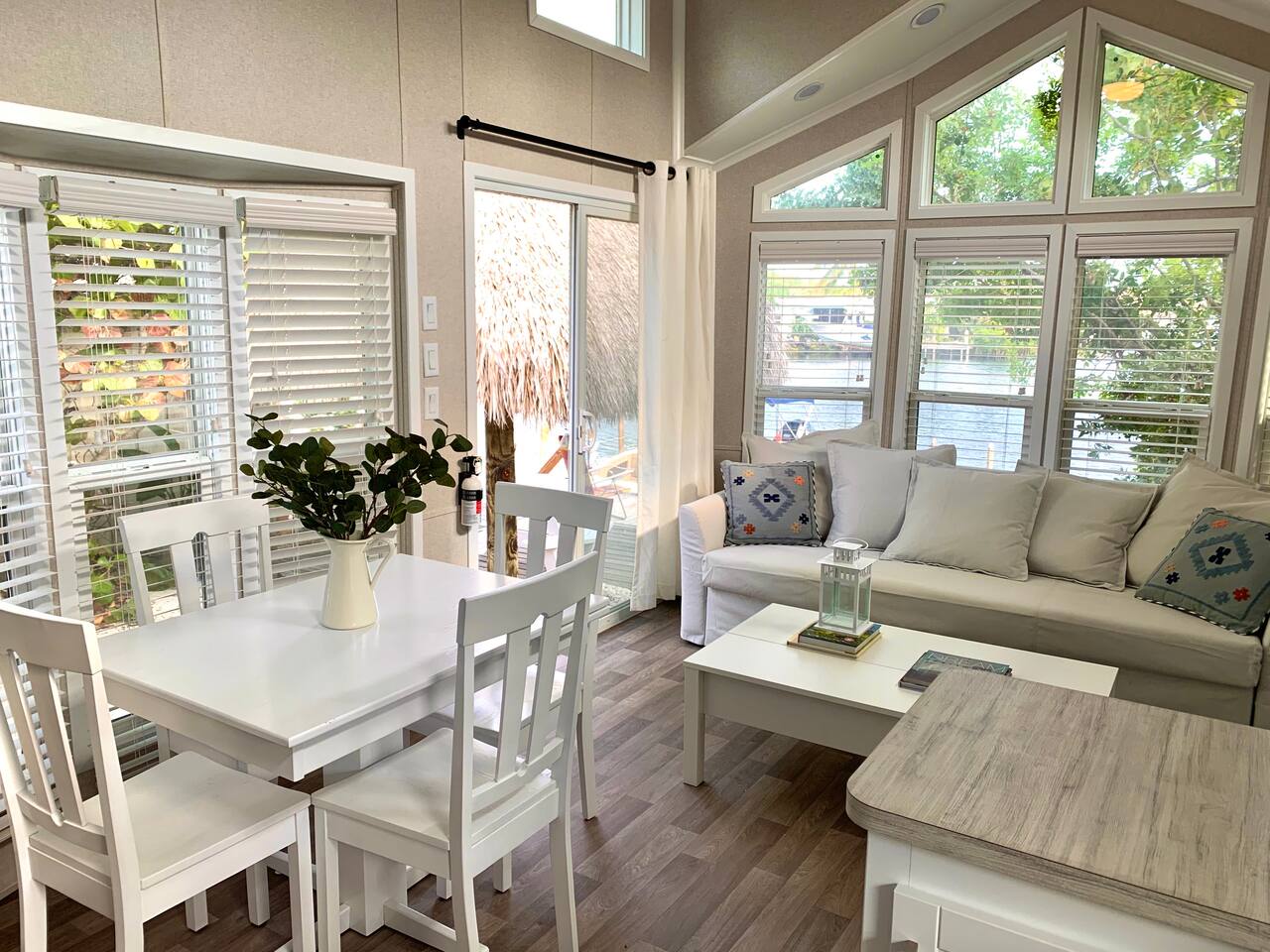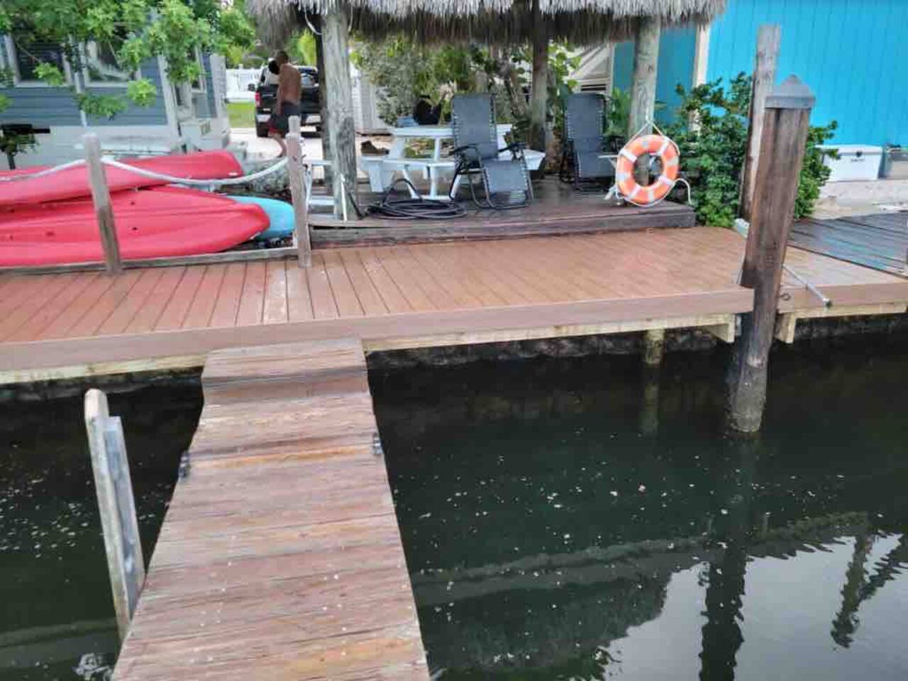 Discover the charm of our private community (Key Largo Kampground) 2 beach areas, heated swimming pool, beach volleyball, a children's playground, laundry facilities, and more. Indulge in the comfort of our tastefully decorated, modern 2BR/1.5BA waterfront tiny house complete w/ a private dock for your boat. Unwind on the spacious deck w/ a tiki hut, large dining table, lounge chairs, and a grill, perfect for relaxing evenings under the patio lights. 2 complimentary kayaks & 2 paddleboards.