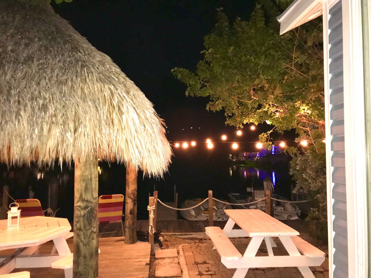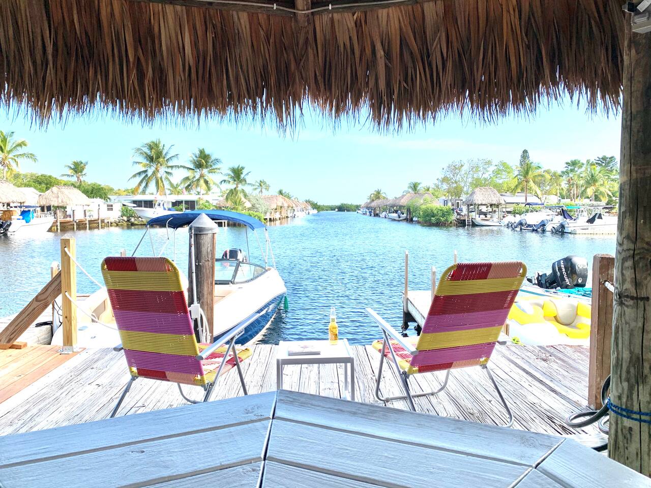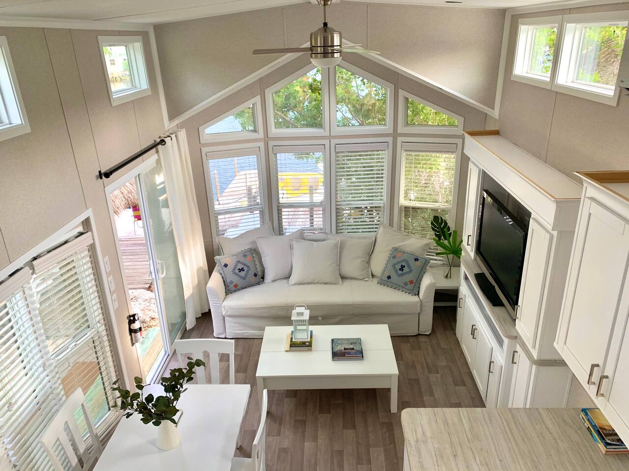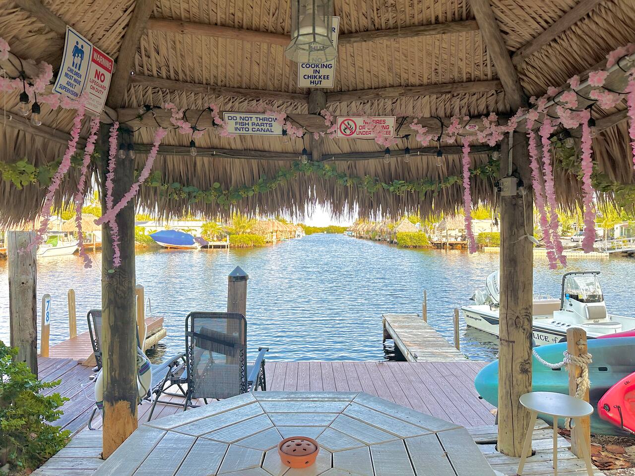Discover the charm of our private community (Key Largo Kampground) 2 beach areas, heated swimming pool, beach volleyball, a children's playground, laundry facilities, and more. Indulge in the comfort of our tastefully decorated, modern 2BR/1.5BA waterfront tiny house complete w/ a private dock for your boat. Unwind on the spacious deck w/ a tiki hut, large dining table, lounge chairs, and a grill, perfect for relaxing evenings under the patio lights. 2 complimentary kayaks & 2 paddleboards.