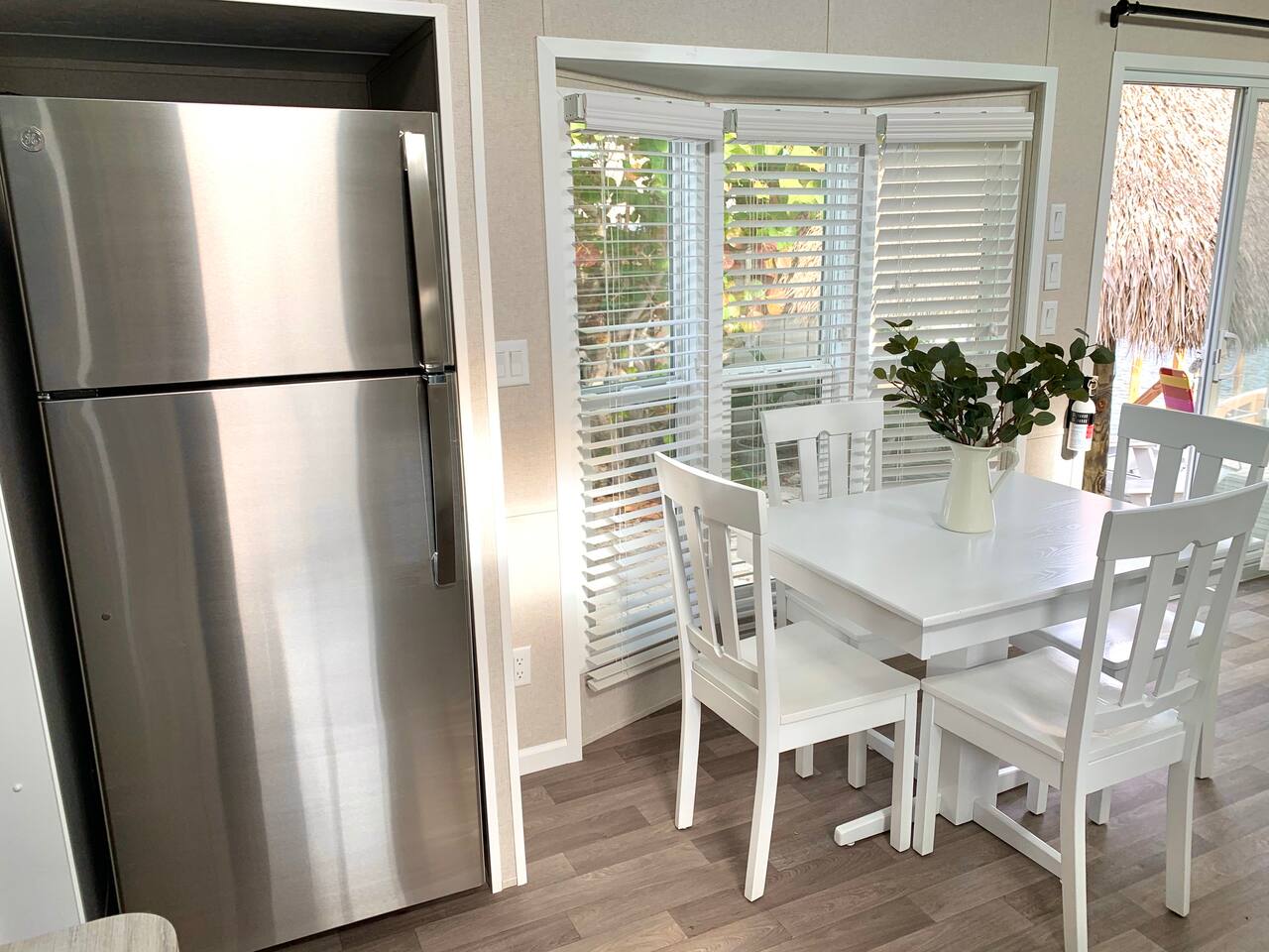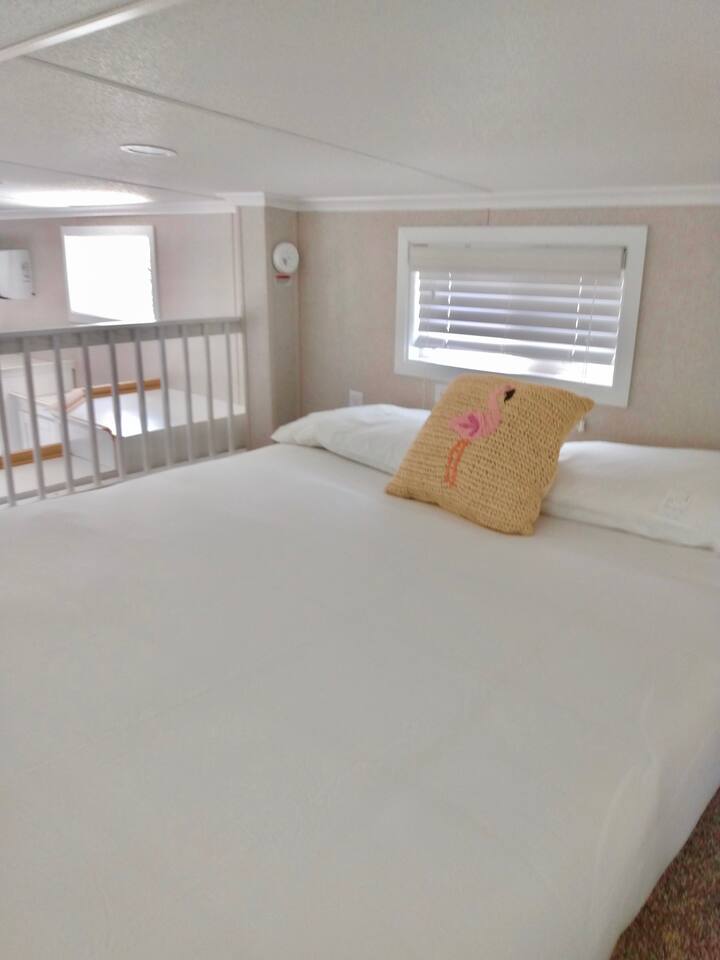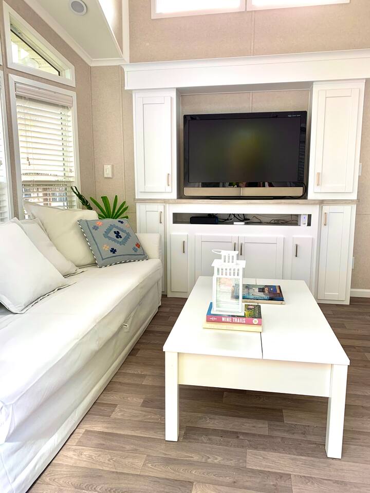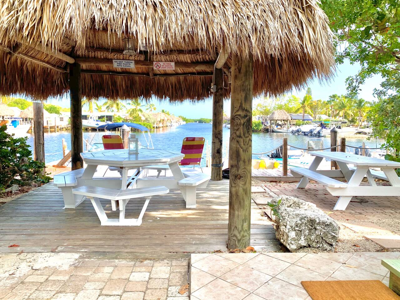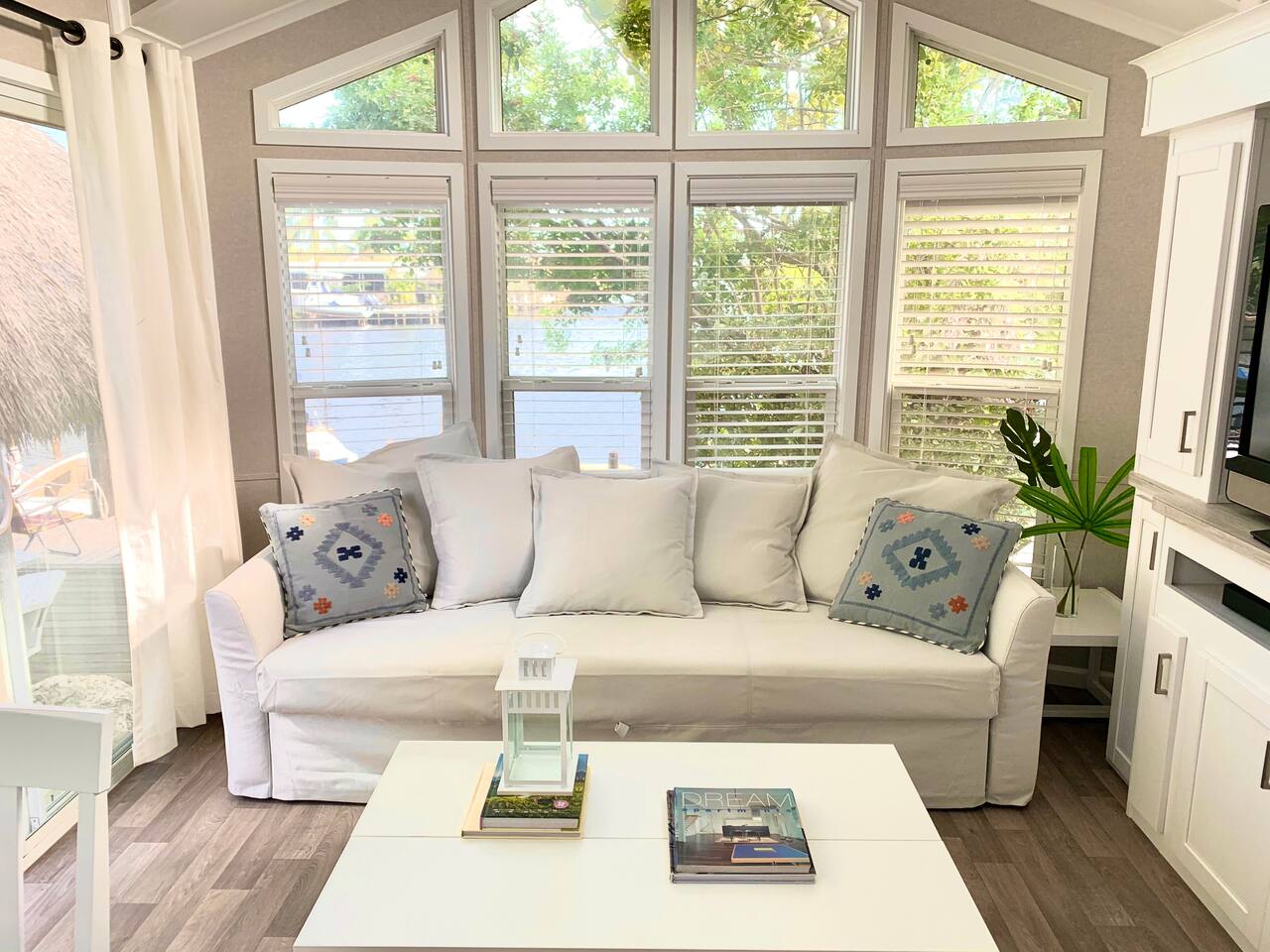 Discover the charm of our private community (Key Largo Kampground) 2 beach areas, heated swimming pool, beach volleyball, a children's playground, laundry facilities, and more. Indulge in the comfort of our tastefully decorated, modern 2BR/1.5BA waterfront tiny house complete w/ a private dock for your boat. Unwind on the spacious deck w/ a tiki hut, large dining table, lounge chairs, and a grill, perfect for relaxing evenings under the patio lights. 2 complimentary kayaks & 2 paddleboards.