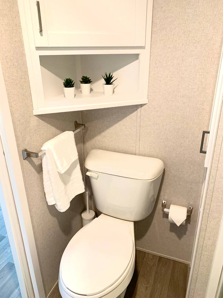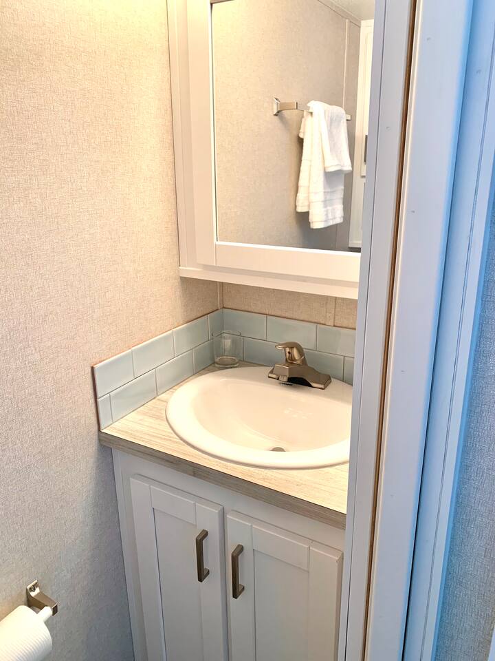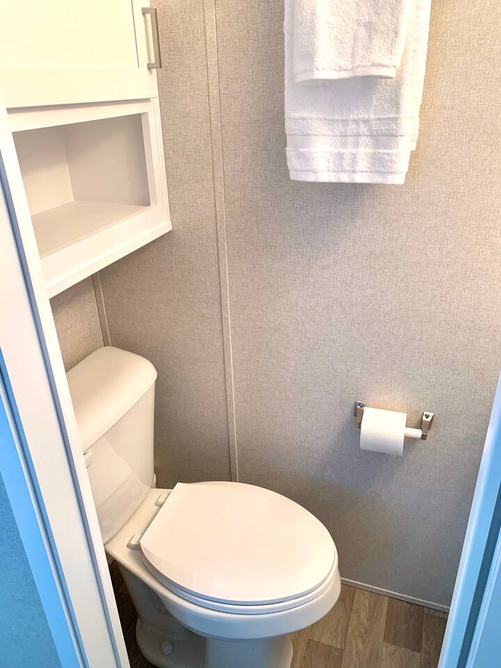 Waterfront Retreat with Private Dock and Resort Amenities Discover comfort and convenience in our spacious waterfront getaway. The master bedroom features a queen-sized bed and en suite half bathroom, while the loft space offers two double-sized beds. For additional guests, there's a queen-sized sofa bed in the living room. Prepare meals in the full-sized modern kitchen, equipped with all the essentials. Enjoy the full bathroom with a shower and complimentary towels and linens. Step outside to the large wooden deck with a tiki hut, perfect for entertaining. You'll have a private dock for boats up to 25', along with a charcoal grill and fish cleaning table. Stay connected with Wi-Fi available in the house and campground lounge. Plus, take advantage of campground amenities including a 24-hour security gate, marina, heated swimming pool, and more. Please note, guests bringing vessels must provide boat and trailer registration and insurance information within 24 hours of booking to avoid delays or extra fees. The house is outfitted with a complimentary single-person kayak, a 2 person kayak and two paddle boards for your enjoyment.